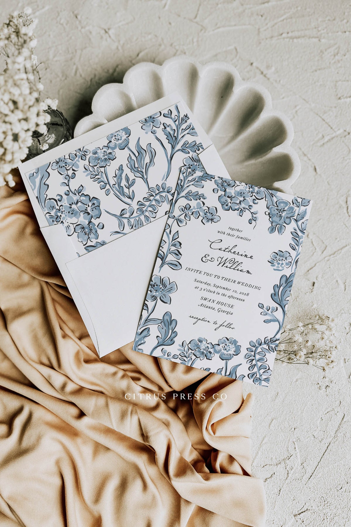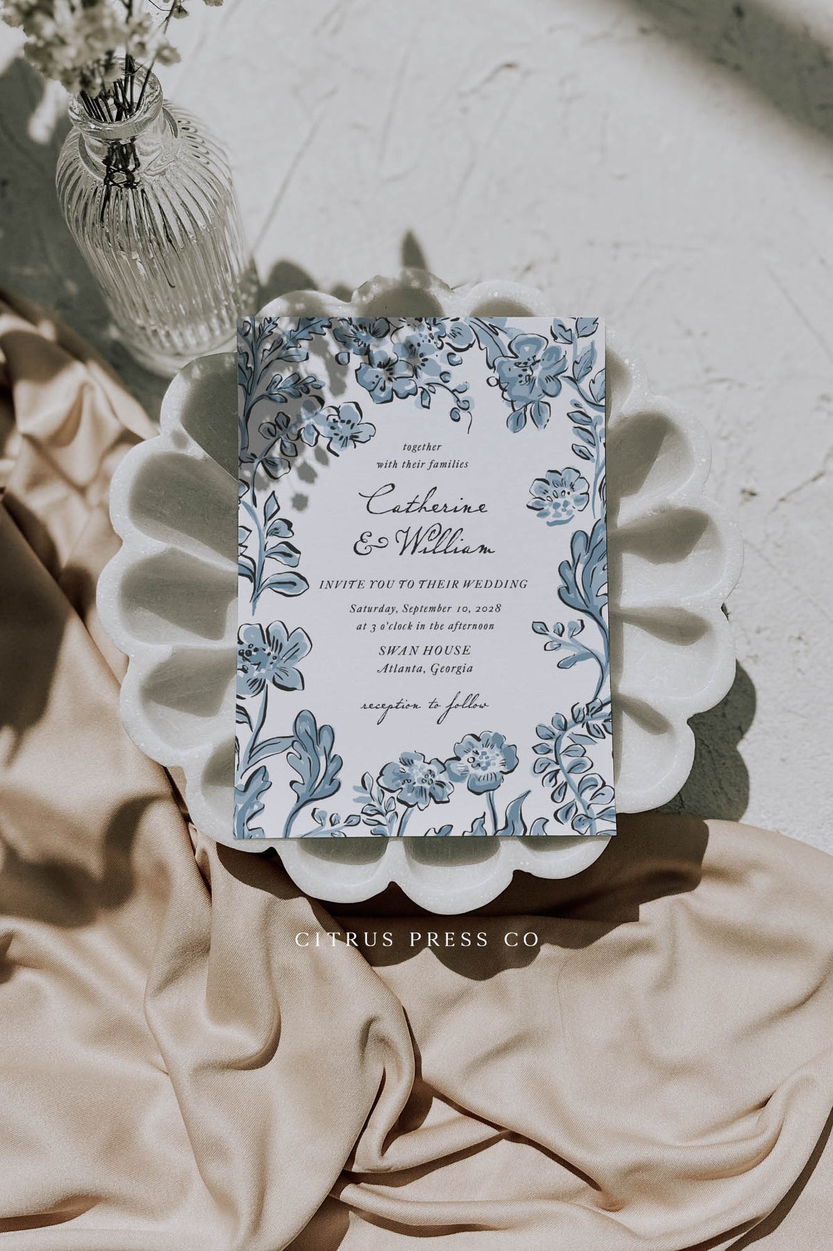 Blue Floral Watercolor doodle sketch wedding invitation with flowing flower accents and statement calligraphy give this design a formal yet light and airy feel. This wedding stationery adds that trendy custom hand-drawn doodle sketch touch with elevated elegance to your event. A true classic with a modern twist.