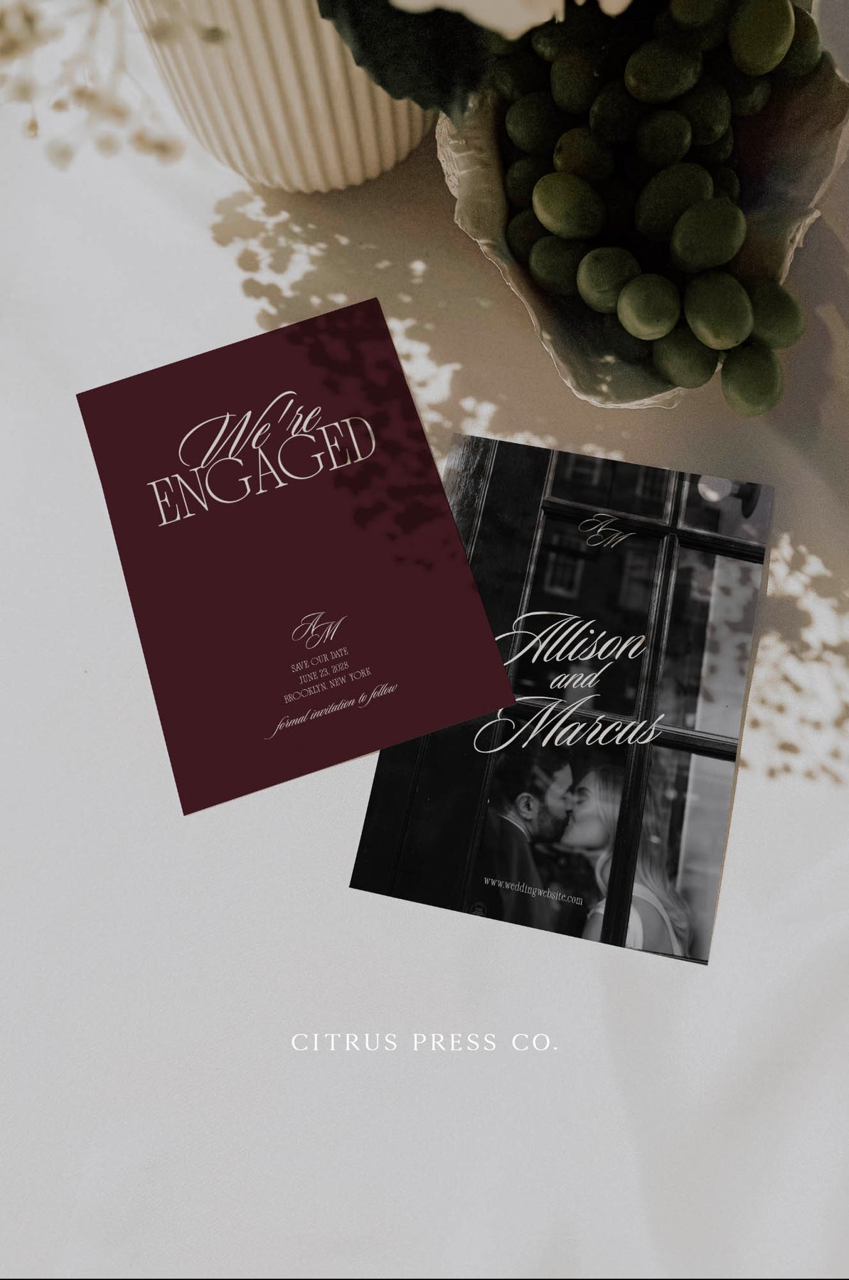 Perfect for fall weddings, winter ceremonies, estate celebrations, ballroom receptions, and destination weddings, this printed save the date sets the tone for a refined and elevated event. An optional engagement photo can be added to the back for a personalized touch while maintaining the sophisticated aesthetic.