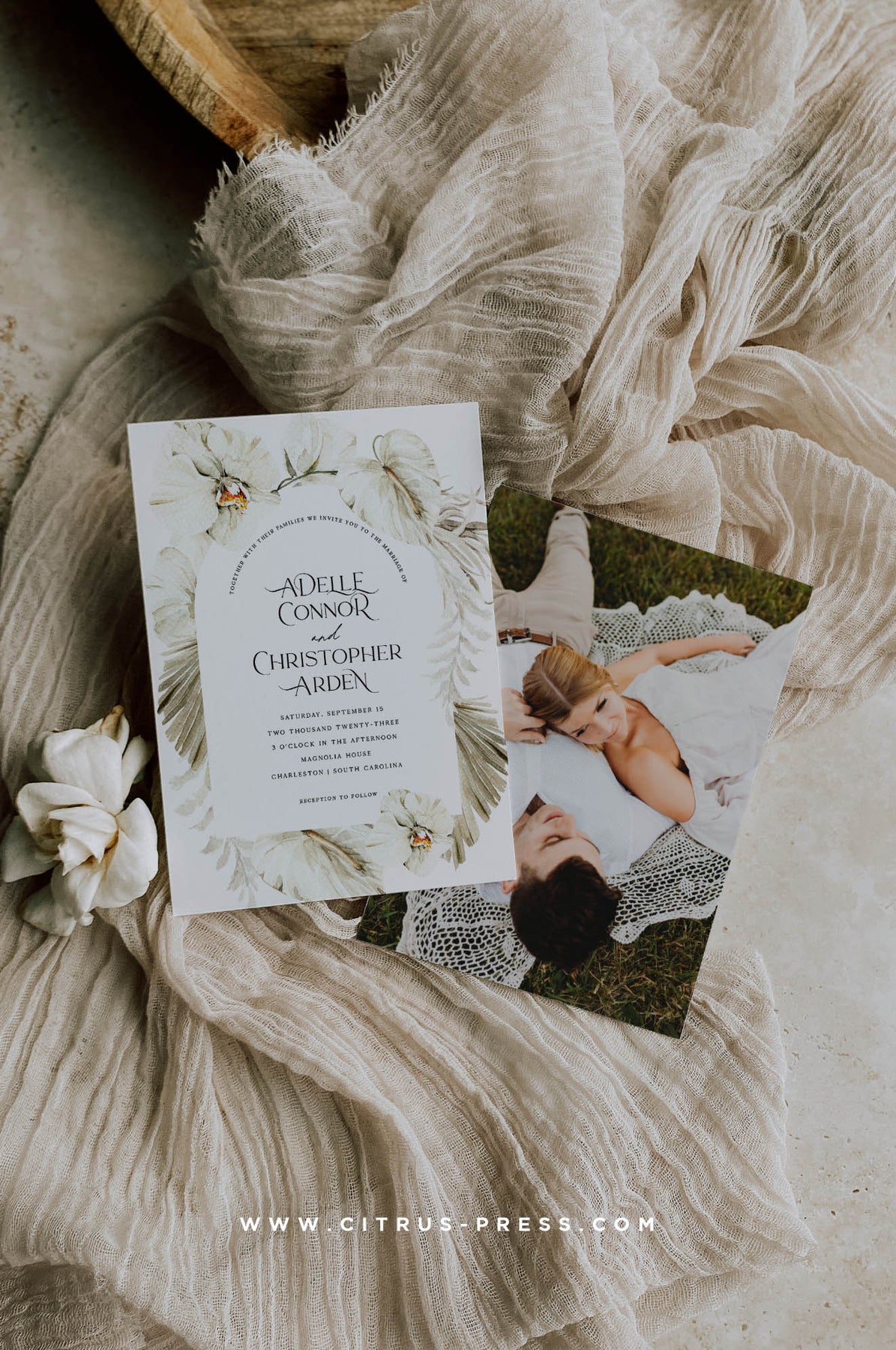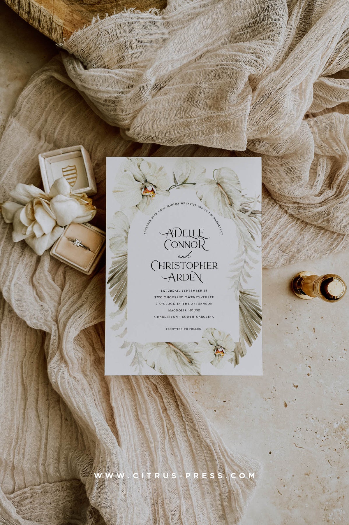 Boho Wedding Invitation with understated typography and white, neutral flowers such as orchid, anthurium and touches of dried palms create a contemporary wedding invitation suite perfect for a tropical outdoor event with desert or boho touches or any couple looking for something different. This fresh look is sure to make a statement when announcing your news.