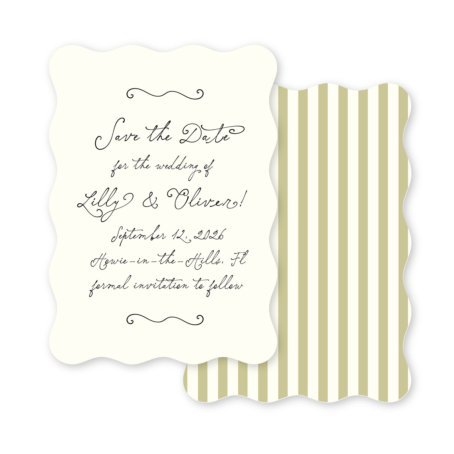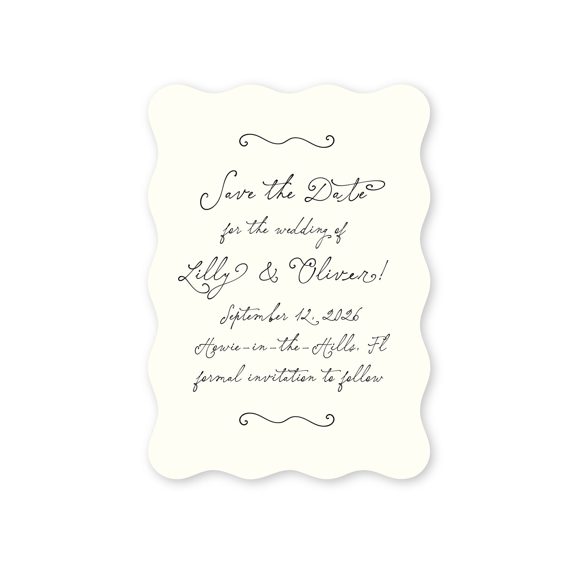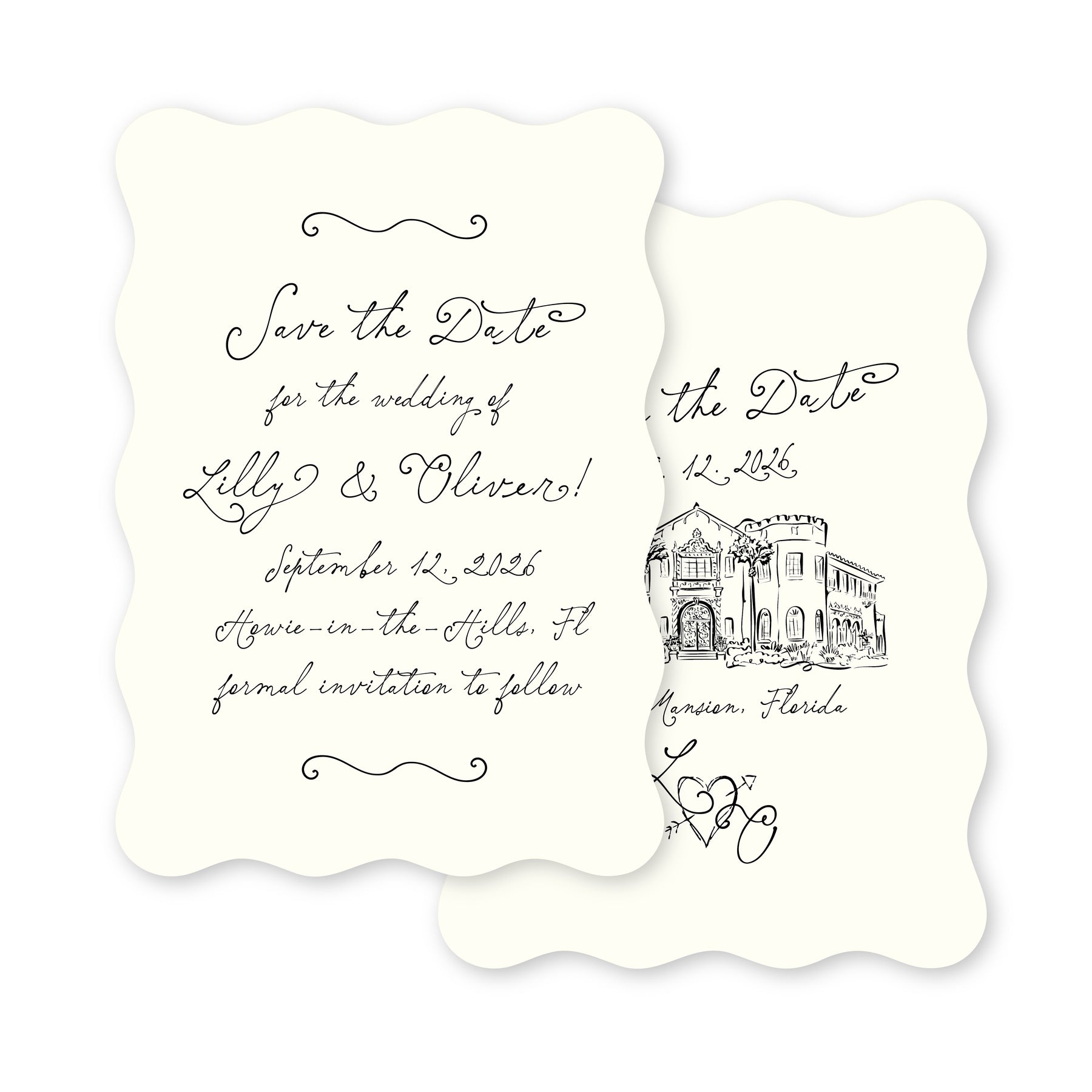 Hand written save the date in our signature wavy die cut features elegant whimsy fonts and personalized hand-drawn illustrations that can be tailored to any color scheme. It includes charming doodles like champagne glasses, wedding cakes, venue sketches, food icons, stripes, love hearts, and monograms, all contributing to a whimsical, romantic, and minimalist clean design.