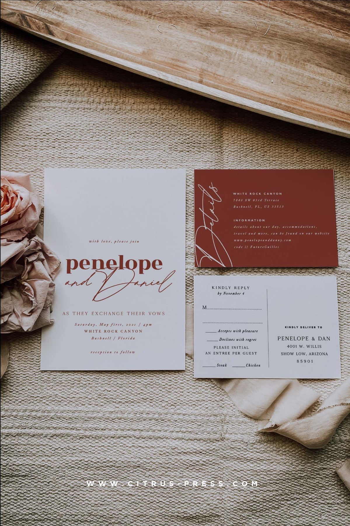 Regular price $0.00Modern and minimal wedding invitation suite called Penelope. Modern fonts and text layouts help make this invitation come to life. That can be in black and white or in shades of rust, sage green, blues or request your own custom colors to suit your wedding day colors.