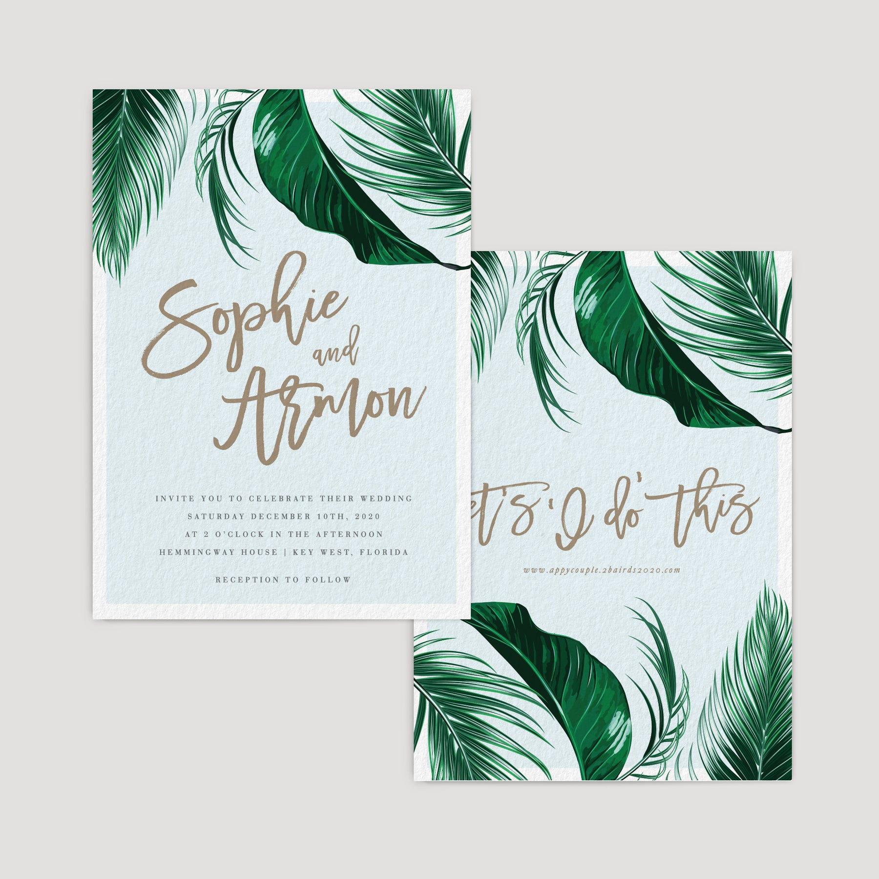 A dream wedding invitation design for any tropical affair! Brilliant banana leaves and hand lettered tan and gray calligraphy make this design a showstopper. Complimenting a variety of outdoor settings but without a doubt, bests suited for a destination, resort-style tropical wedding.