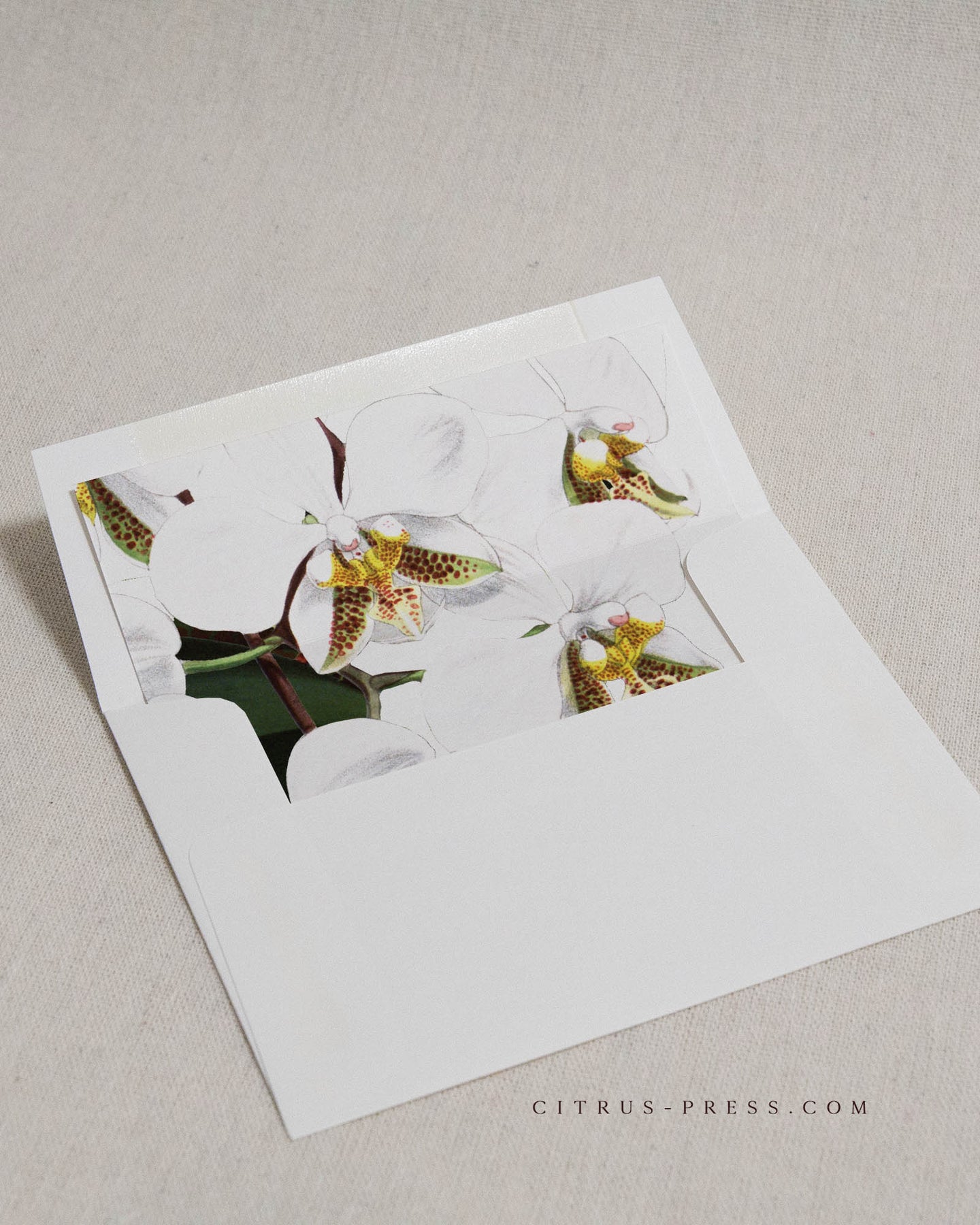 PAPER: Printed on thick lux textured 120lb card. Comes with blank envelopes in the color of your choice as listed below. Liners, Addressing and wrap bands are sold separately.